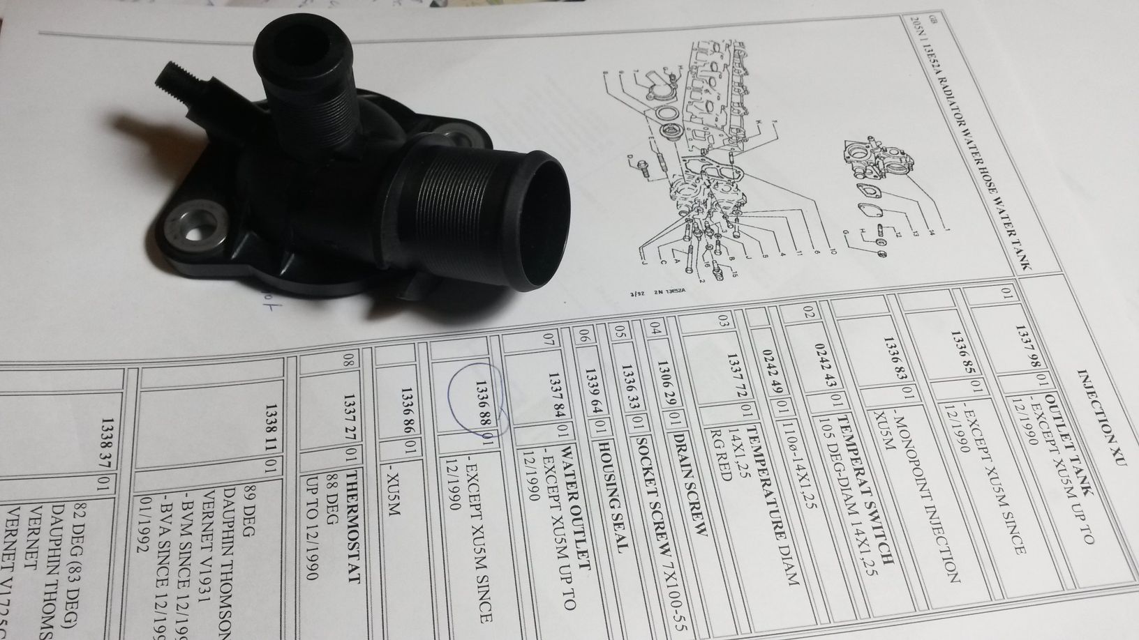 Laut Peugeot-Katalog müsste Teilenummer 1336 88 "WATER OUTLET - INJECTION XU - EXCEPT XU5M SINCE 12/1990" eigentlich die richtige sein. Damit erhalte ich aber folgendes Teil, was noch einen zusätzlichen Anschluss hat: