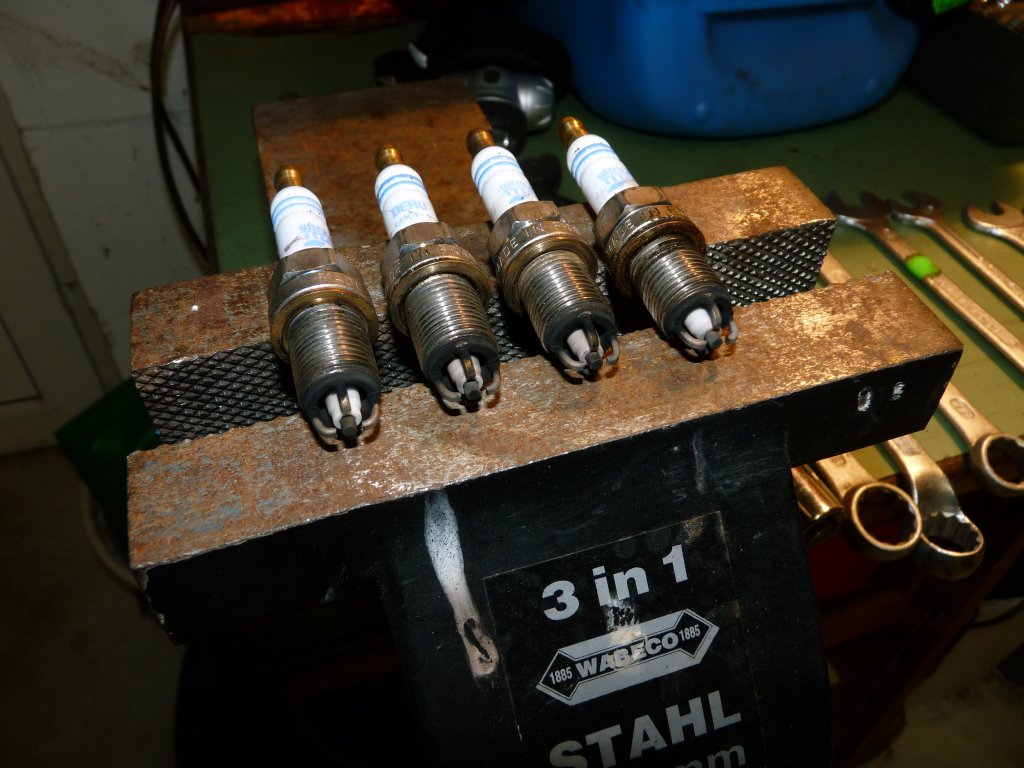 Aber der Reihe nach: Die aktuellen Zündkerzen sind BERU UXT 1 SB (UXF 79). Und das Kerzenbild finde ich gar nicht so schlecht, vor allem alle 4 Zylinder gleich, siehe Bild: