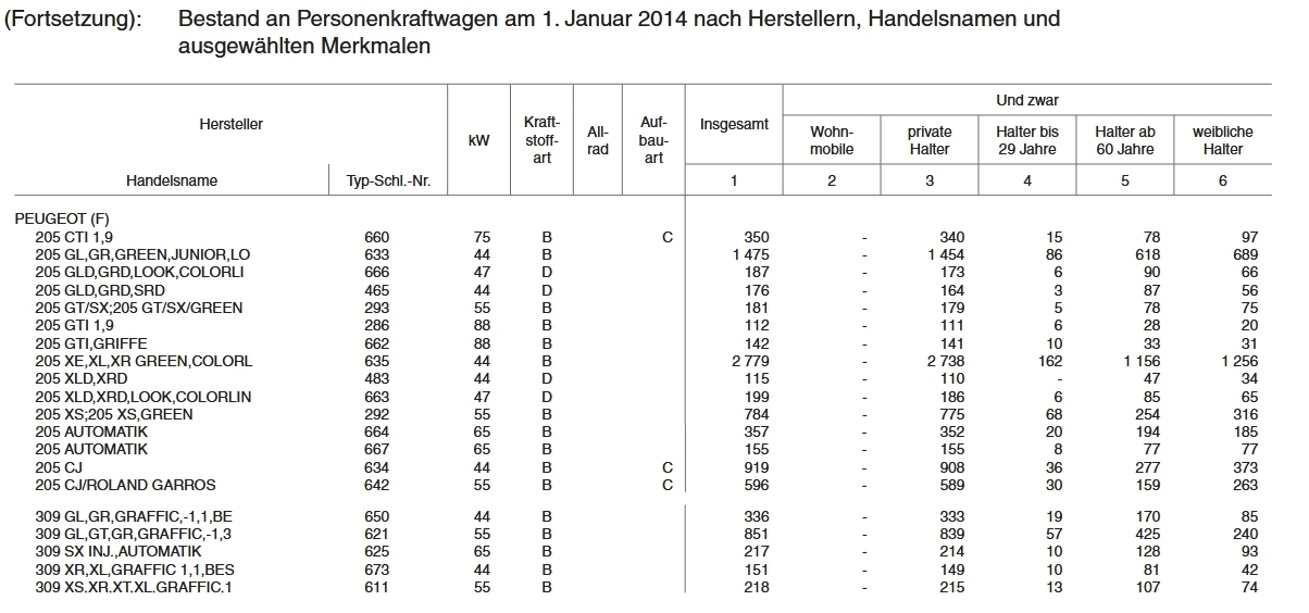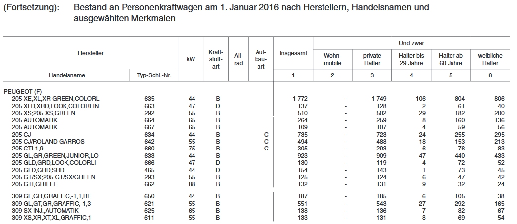 Der 205 GTI 1.9 (3003/286) ist am 1.1.17 noch 98mal in Deutschland angemeldet.