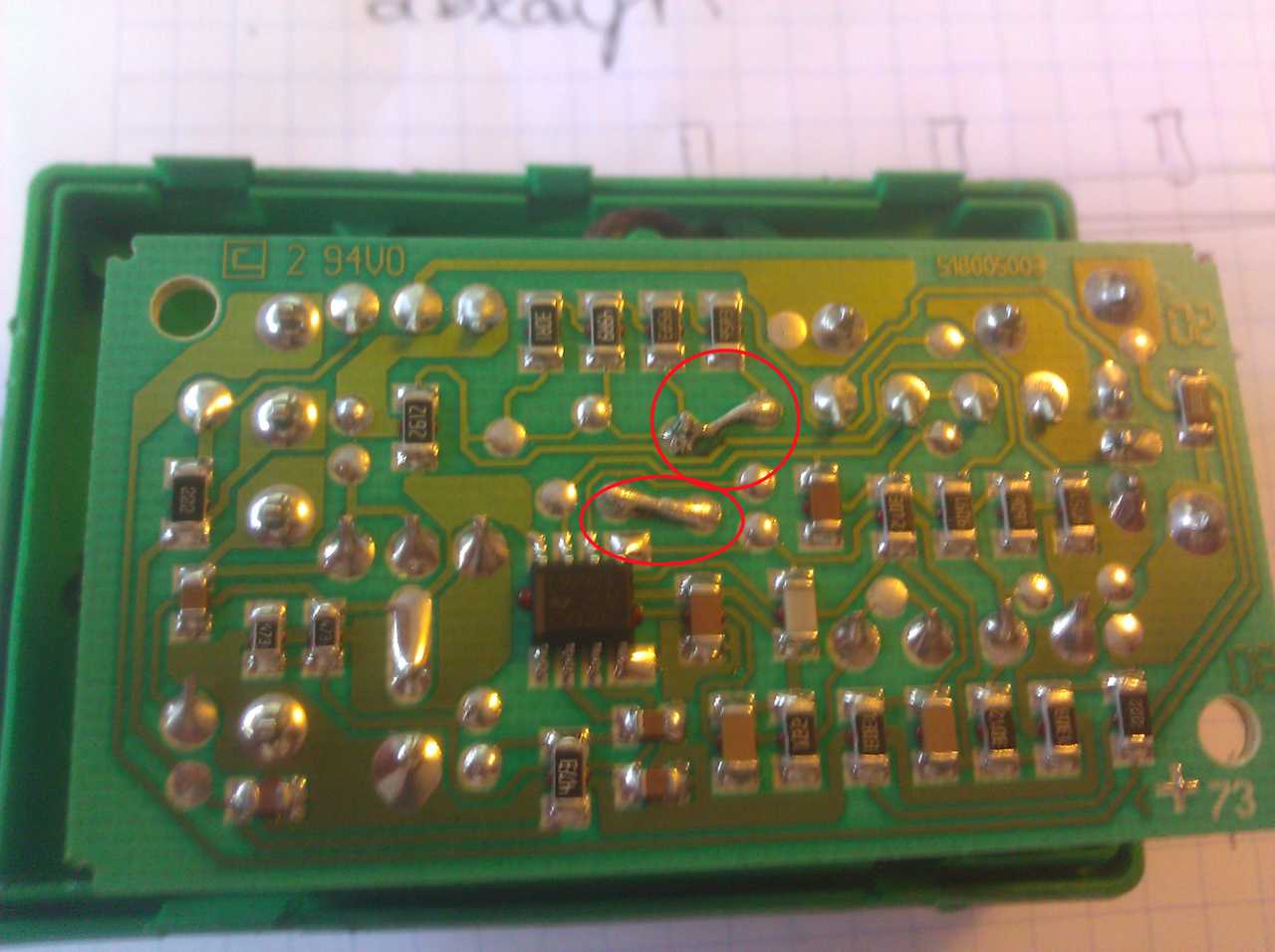 Die rot markierten Leiterbahnen musste ich prov. flicken mit Zinn. Gegen 10 is der Chef außer Haus, da werd ich testen obs was gebracht hat. Vorglühen können muss er ja nicht, aber die Platine wäre dann wenigstens wieder im Bussystem angemeldet. Vlt hilfts...