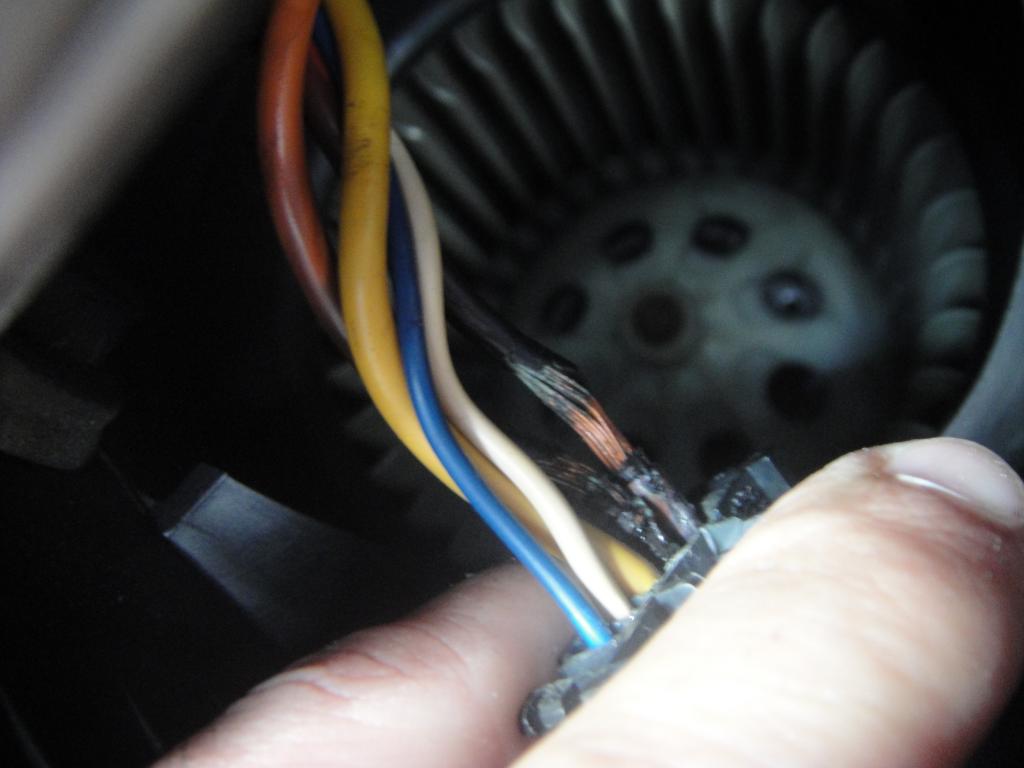 An dem Stecker kommen vier Kabel mit unterschiedlichem Querschnitt an. Wenn man die ersten beiden (dicksten) gut einen cm abisoliert und dann zusammen lötet, funktioniert das Gebläse wieder. Hab ich so gemacht und hat funktioniert.