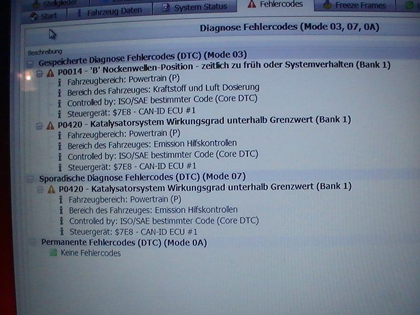 Hallo,ich bin neu hier und möchte Euch um Hilfe bitten.Bei meinem 207,Bj.2007,70KW,taucht schon wieder diese Fehlermeldung auf,siehe Anhang.Erst brannte die Motorlampe nur sporadisch und mit 50km Autobahn war die wieder weg.Jetzt hilft das nicht mehr.Das Auto zieht nicht mehr,frißt aber unheimlich Sprit und hört sich an als wenn ihn etwas würgt.Könnt Ihr mir an Hand der Codes etwas sagen?