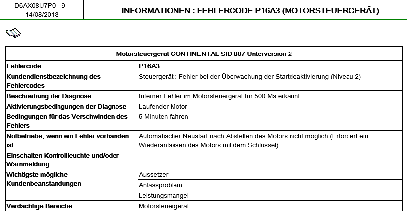 Den gleichen Fehlercode habe ich bei meinem Citroen DS3 mit 1.6 HDI Motor auch immer wieder. Ich lösche den Fehler, was auch funktioniert, aber nach kurzer Zeit steht er wieder im Fehlerspeicher. Allerdings habe ich bis jetzt noch keine Probleme beim Starten oder fahren des Autos bemerkt. Darum kann ich nicht wirklich was mit dem Fehler anfangen, und weis auch nicht genau was er bedeuten soll. Wie gesagt, funktioniert das Auto ganz normal, allerdings war vor ca 1 Jahr das Steuergerät der Start Stop Automatik defekt. Nach dem Tausch mußte ich es ja neu an lernen, und ich vermutete bisher, das ich dabei einen Fehler gemacht habe und der P16A3 davon kommt. Wäre echt Interessant mal hier etwas weiter zu kommen.