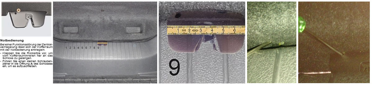 Im Bild 1.2 und 1.3 mal eine "Geisterbilddarstellung" der Lage des Schlosses. Einmal im grossen, wie sich der Anblick dem InDenKofferraumKletterer bietet, und einmal im Detail. Wie man hier sieht, ist es etwas rechts von der Mitte des 9. Feldes von links zu suchen, und zwar oberhalb des Schlitzes zwischen Ladewand und Kofferraumeckel (in Bild 1.4 ein "Live view").