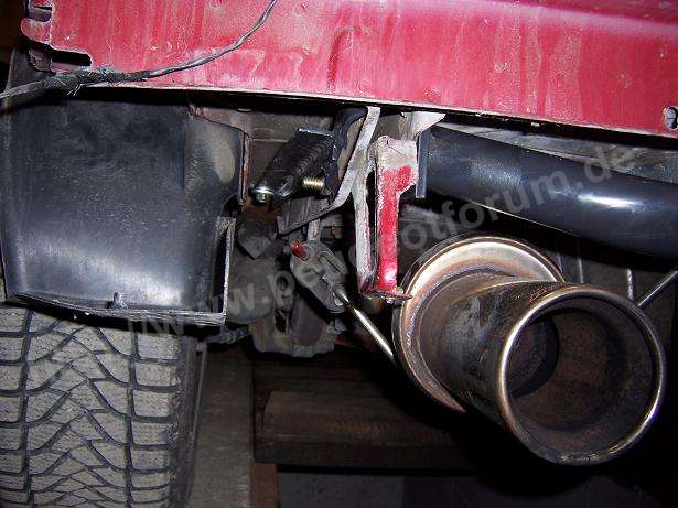 Danach wird die hintere innere Endschalld?mpferhalterung weg geschraubt. Als Tipp: Das ganze vorher gut mit WD40 einspr?hen. Und die schrauben mit viel Gef?hl l?sen!! Jetzt wird aus dem Montagesatz die 5mm starke B?chse gebraucht. Die kommt auf den Gewindebolzen auf der linken Seite. Au?erdem wird die AHK Grundtr?ger montiert. Eine zweite Person ist hier sehr hilfreich. Die Schrauben noch nicht fest ziehen. Erst Handfest anschrauben, mehr nicht!