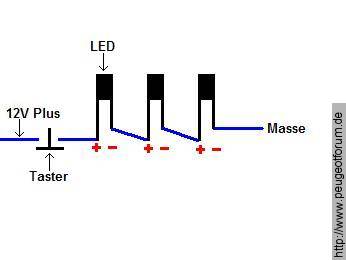 Danach werden die LEDs in Reihe geschaltet: (den Vorwiderstand sollte man nicht vergessen)