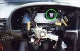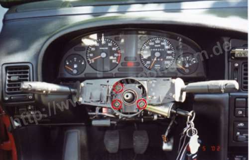zuerst die lenkradh?henverstellung auf die tiefste stufe stellen. dann mu? das emblem auf dem lenkrad vorsichtig gel?st werden. am besten mit einem d?nnen, flachen werkzeug. das teil ist nur gesteckt. danach kann man das lenkrad mit einer 21er-nuss l?sen. wenn die mutter ab ist, muss man das lenkrad ein bissel hin und her wackeln, damit es sich l?st. anschlie?end die abdeckung der lenkung l?sen. diese ist mit 4 schrauben besfestigt, zwei links oben, zwei rechts oben und eine weiter unten. der obere teil geht einfach ab, der untere teil muss nach oben gezogen werden, da er unten arretiert ist. die schrauben kann man am besten mit einem langen kreuzschraubenzieher l?sen. ein teil aus einem handel?blichen werkzeugkasten, bei dem die schraubenzieher etc. zusammengesteckt werden, kann man hier nicht gebrauchen. die passen nicht durch die l?cher. da muss ein altbew?hrter schraubenzieher her.