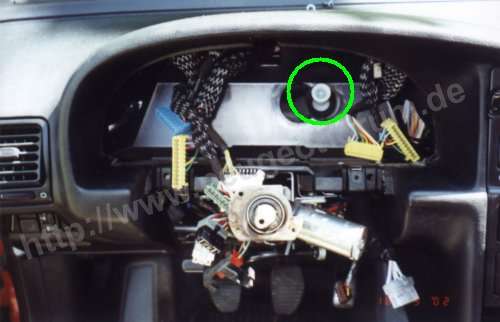 das loch links daneben kann man nicht nehmen, um die tachowelle sp?ter anzubringen, da diese in einer f?hrung l?uft und man auch von unten nicht ran kommt. nun alle stecker an der anzeigeeinheit anbringen (die kann man nicht verwechseln, die passen jeweils nur auf genau einen steckplatz an der einheit). jetzt die anzeigeeinheit langsam in das armaturenbrett schieben, dabei drauf achten, dass die kabel nicht ein kn?ul werden. die einheit sitzt richtig, wenn sie auf den drei schraubpunkten von alleine aufliegt. nun die anzeigeeinheit festschrauben. danach die tachowelle vom motorraum aus wieder in die spritzwand dr?cken. dabei ist ein bisschen vasiline o.?. auf der gummikugel ganz hilfreich. jetzt das lenkrad aufstecken und das auto kurz bewegen, ob das tacho was anzeigt...sonst muss man nachher alles wieder ausbauen. wenn das tacho nix anzeigt, nachsehen, ob die tachowelle im motorraum wieder ordentlich sitzt, ansonsten die einheit nochmal ein st?ckchen rausziehen und wieder einsetzen. wie gesagt, wir haben das 3 mal probiert und jedes mal hat es geklappt. der rest ist dann wie beim ausbau. leiste wieder aufklipsen und den lenkstock mit kabeln wieder festmachen. diesen kann man ein bisschen drehen, um die hebel waagerecht zu haben. danach die abdeckung der lenkung wieder anbringen. dann das lenkrad aufsetzen und festschrauben.