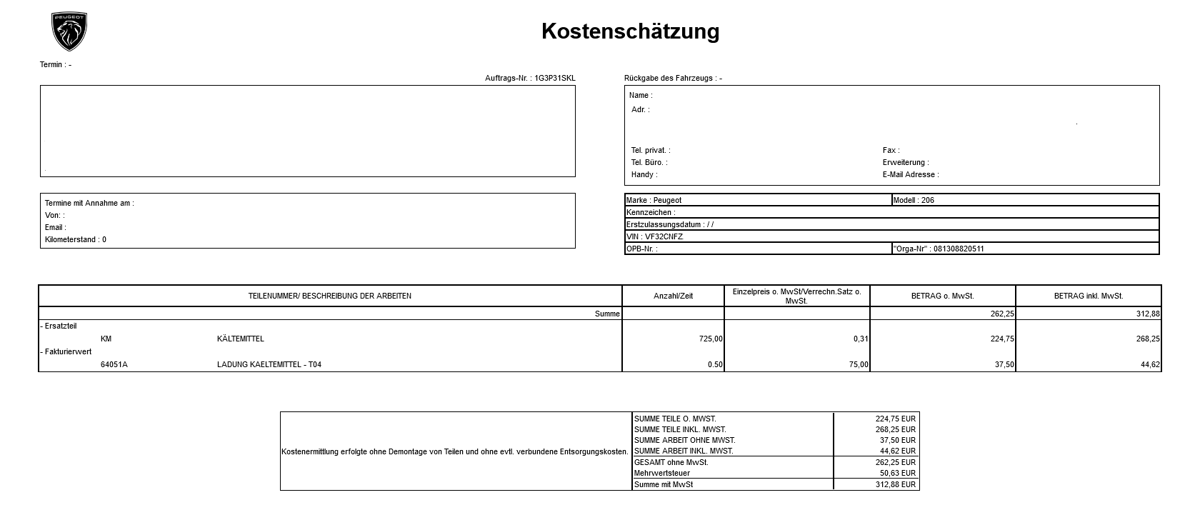 206 hat, mit TU Motor, 725g Kältemittel drauf. Wenn Klimaanlage leer und dicht ist, kommt man mit 70 - 100 € im Leben nicht hin.
