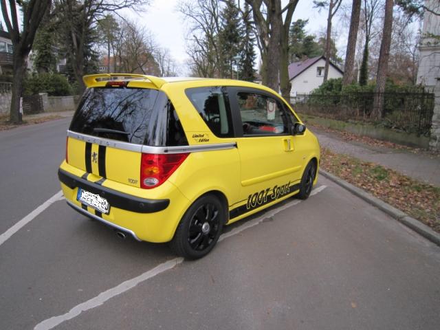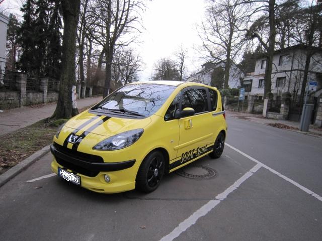 Im Dezember 2009 habe ich einen Peugeot 1007 in der Ausführung "110 2-Tronic Sport Limited Edition" gekauft (s. beigefügte Bilder Eigenes Fahrzeug (1) und (2)). Diese Limited Edition hat einen Front- und einen Dachheckspoiler sowie eine Tieferlegung und BBS-Alufelgen im Sommer. Die Wagenfarbe ist gelb und an den Schwellern ist ein großer Aufkleber mit dem Schriftzug "1007 Sport" angebracht. Auf den C-Säulen befinden sich ein kleiner Schriftzug "Limited Edition" und zwei kleine Löwen im RC-Design. Die Erstzulassung erfolgte 2005.