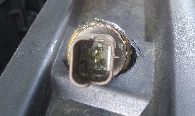 Der Sensor wird undicht (Haarriss), dadurch drückt das Kühlwasser über die Pins im Sensor bis zum Stecker.