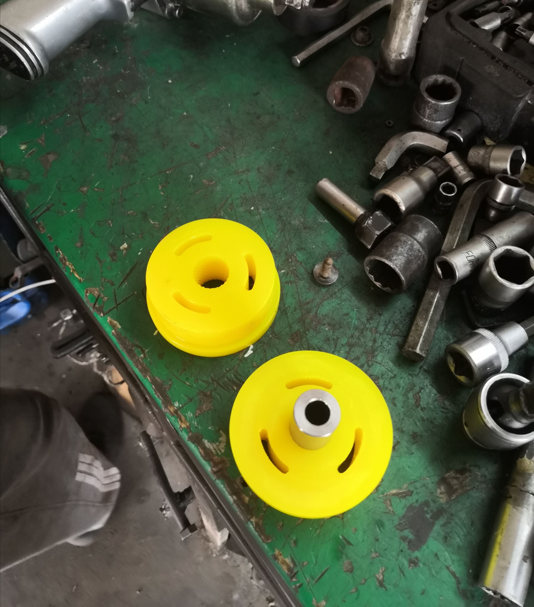 So heute kam die Gummibuchse von powerflex an hab sie sofort eingebaut, hab das alte gummi aus der vermantelung rausgeklopft und mit einem Schleif aufsatz gründlich alle Reste entfernt.