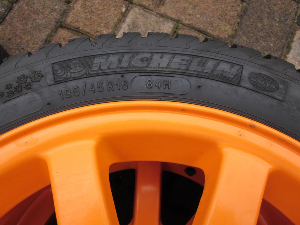 Auf den Felgen sind Premium Winterreifen von Michelin (Typ Alpin A4 - Made in Germany) in der Größe 195 45 R16 84H montiert. Profiltiefe liegt 2x bei 5,5mm und 2x bei 6,0mm. Alle 4 Reifen sind ohne Schäden, gleichmäßig abgefahren und sind DOT 2911.