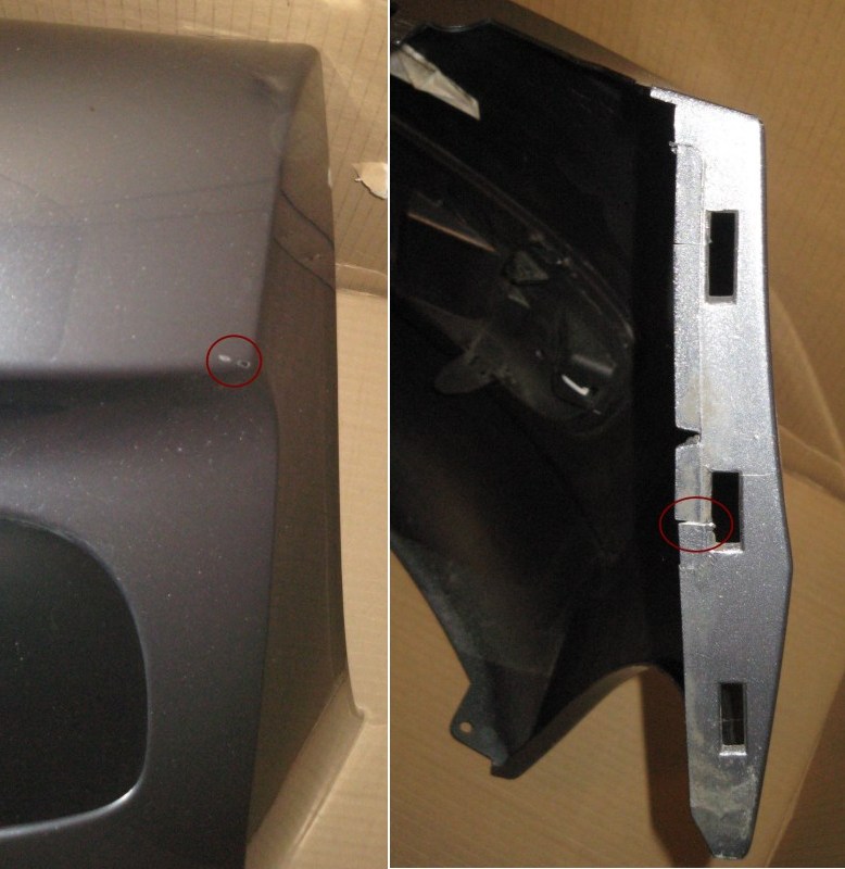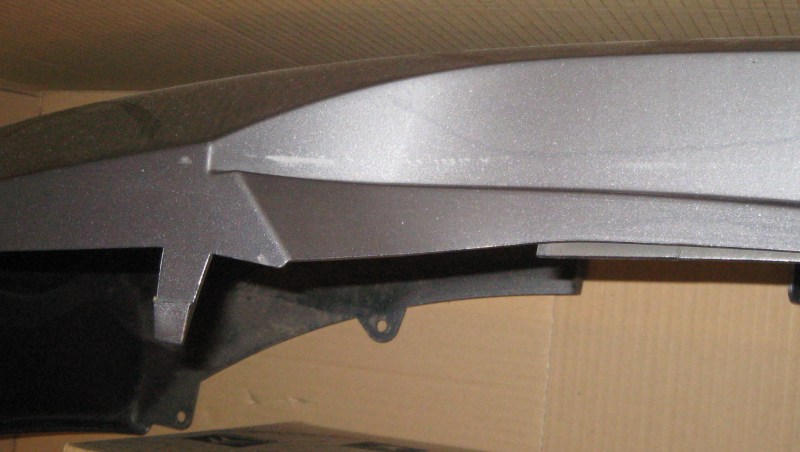 Die Stoßstange weißt KEINE Beulen oder Kratzer im Material auf. Es gibt jedoch die üblichen Gebrauchsspuren die nach drei Jahren (im Sommer 2010 getauscht) auftreten, so z. B. durch das Problem mit dem Kofferraumdeckel, der gelegentlich auf die Stoßstange aufschlägt. Sie weist auch einen winzigen Lackschaden auf. An der seitlichen Befestigung ist eine der Nasen wohl beim Ausbau gebrochen, die werde ich aber noch mit Epoxidharz kleben, danach sollte das wieder wie neu sein.