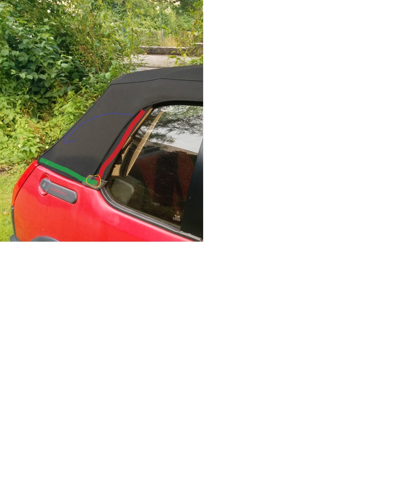 So, nun habe ich mein Cabrio erstmal wieder. Hier habe ich mal ein Foto ein bisschen bemalt, hoffe man kann es verstehen. Die C-Säule (hier rot) klappt nach hinten runter. Normalerweise sollte sie neben das Halteblech (grün) klappen. Aber an dem Punkt (gelb) schlagen die beiden Bleche zusammen. Da ist der Punkt wo der Winkel des Halteblechs wohl nicht stimmt. Der Sattler hat verschucht das Blech zurecht zu biegen aber ohne großen Erfolg. Außerdem geht der Kofferraum nicht mehr auf weil die Bleche wohl ein Stück zu lang sind, bzw hinten auch nicht passen.