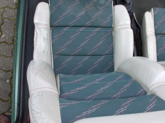 Die Ausstattung ist ein einem brauchbaren Zustand; das untere Seitenpolster des Fahrersitzes ist wie üblich runter, das Leder an der Stelle hat ein kleines Loch. Die Polster des Beifahrersitzes sind dagegen ok. Ich habe ein Foto des Fahrersitzes angehängt.
