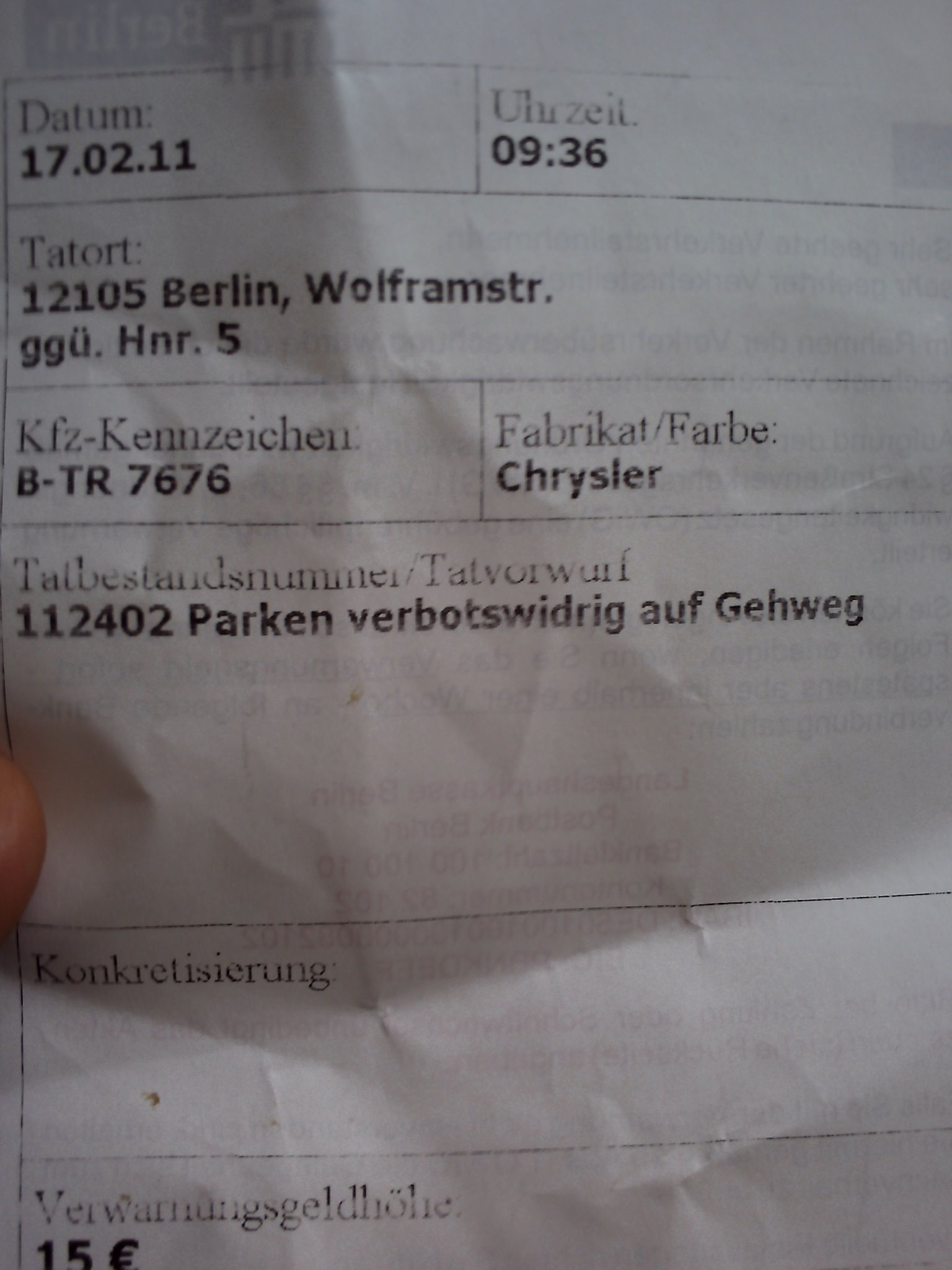 Wie gesagt, ich zahle die Strafe, darum geht es mir nicht, mir gehts mehr um die Konkretisierung mit den vier Rädern.