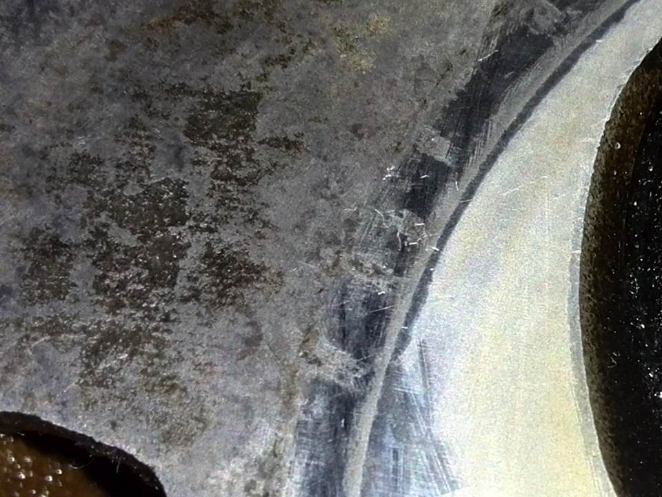 Jetzt habe ich beim Reinigen nur das Problem entdeckt, das im Bereich der Metallringauflage unebenheiten vorhanden sind sowie daneben um die Wasserkanäle. Dort sieht es ein bisschen so aus wie Kaviationsschäden. Ich habe das ganze mal versucht in Bildern einzufangen.