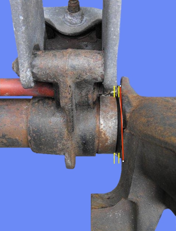 Sehr gut erkennen lässt sich eine sterbende Achse, indem man den Spalt, der zwischen Schwingarm und Traverse vorhanden ist, mal genau inspiziert. Der muss über die gesamte Länge gleichmässig sein (gelbe Linien). Ist der oben enger als unten (rote Markierung)- Lagerschaden. einfach mal saubermachen und kontrollieren.